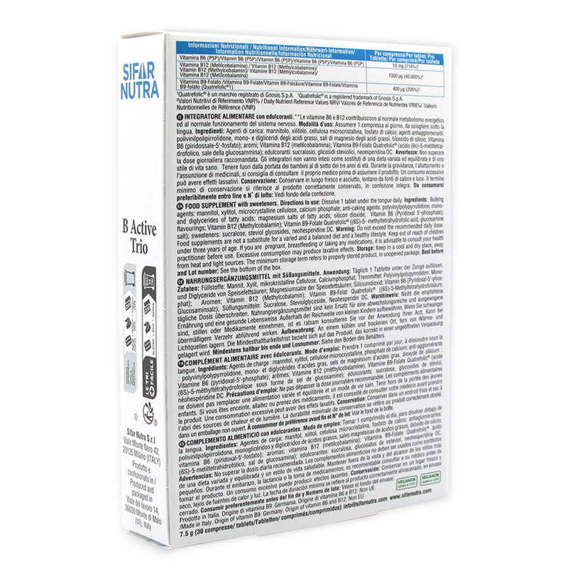 B Active Trio contiene tre tipi di vitamine (B12, B9 e B6) che hanno dei ruoli diversi ed essenziali nel nostro organismo. Tutte e tre le vitamine contribuiscono alla normale funzione del sistema immunitario, alla riduzione della stanchezza ed affaticamento, alla normale funzione psicologica e al regolare metabolismo dell’omocisteina