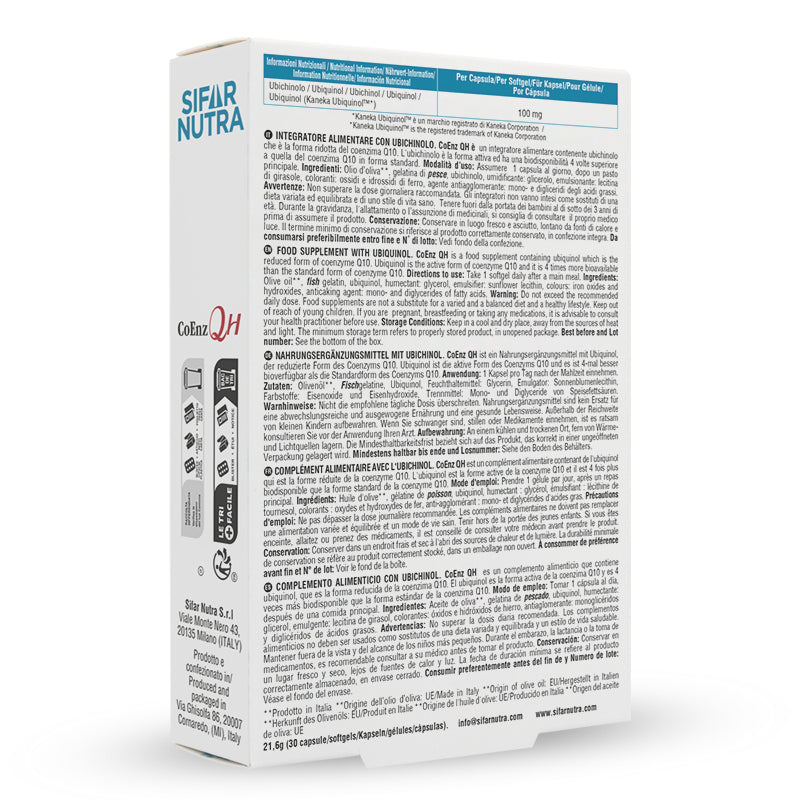 CoEnz QH contiene ubichinolo, la forma ridotta di coenzima Q10 (CoQ10) ad elevata capacità di assorbimento. Il coenzima Q10 coinvolge il trasferimento degli elettroni nei mitocondri e in questo modo contribuisce alla produzione di energia nelle nostre cellule. È pertanto un elemento indispensabile per i tessuti del cuore e del cervello (o sistema nervoso), il tessuto muscolare, il tessuto scheletrico e il fegato, in cui il consumo di energia è maggiore.